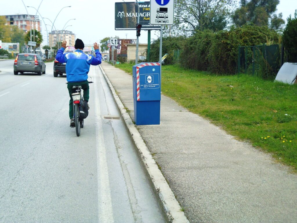 Porto Sant’Elpidio. Passato il ponte si gira all’altezza della rotatoria verso il mare. Ampia corsia ciclabile fino all’incrocio
